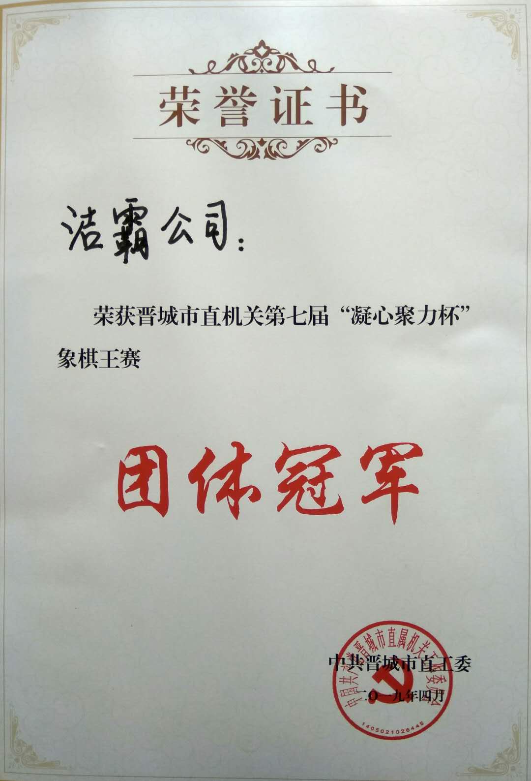 | 我公司榮獲晉城市直機關第七屆“凝心聚力杯”象棋王賽團體冠軍 |