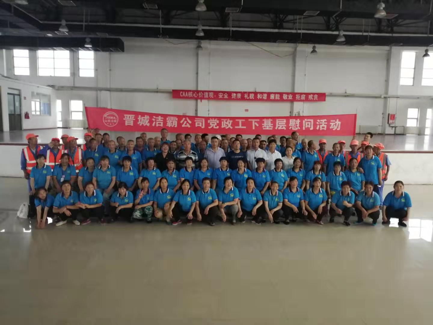 進(jìn)入大暑以來,連日高溫、驕陽似火,酷暑難耐。7月26日下午,晉城潔霸公司黨政工慰問活動(dòng)小組來到了暑期“情系一線”下基層慰問系列活動(dòng)的第四站富士康晉城科技工業(yè)園A區(qū),向辛勤奮戰(zhàn)在富士康一線的員工表示慰問,公司總經(jīng)理程晉軍從百忙之中抽身出來親自參加了慰問活動(dòng),傳遞了公司對員工的關(guān)愛。