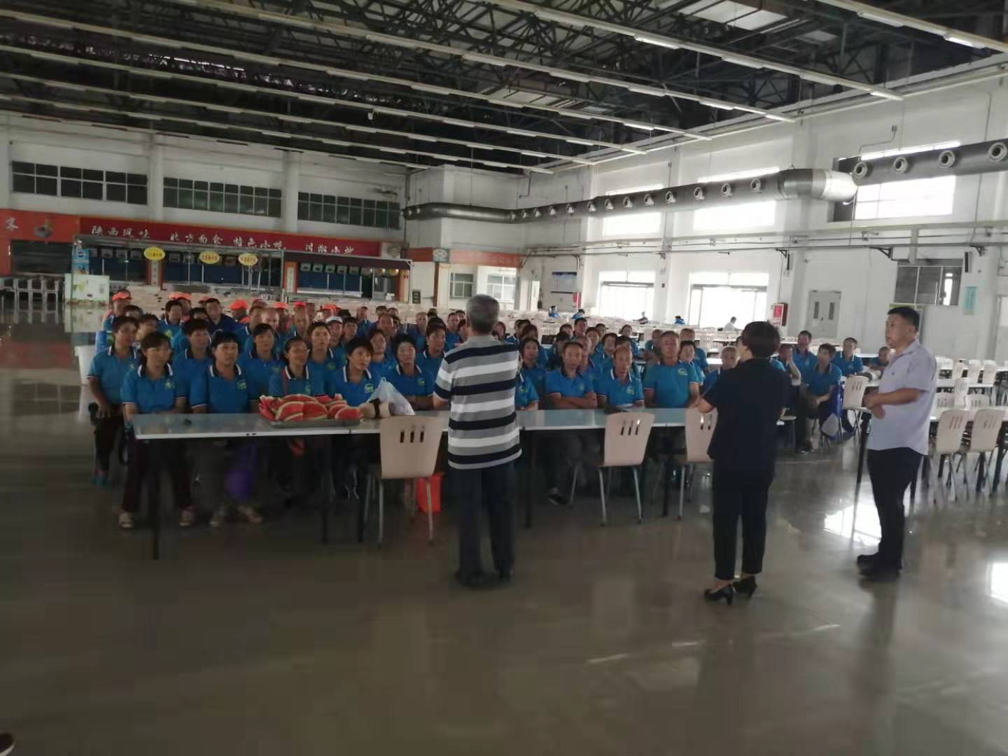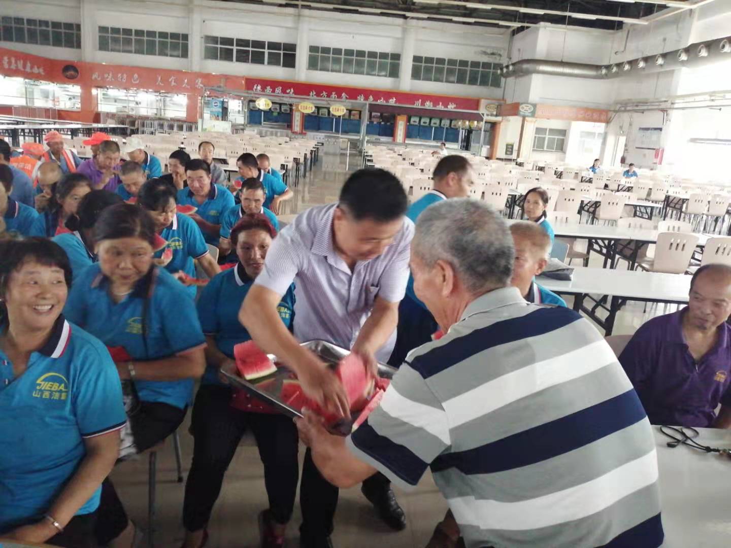 在富士康餐廳二樓,利用工作人員切西瓜的間隙,公司總經(jīng)理程晉軍作了簡短的講話。他說,前一段時(shí)間,公司召開了“安康杯”勞動(dòng)競賽動(dòng)員大會,大家要提高安全意識,始終把安全工作放在心上。他囑托大家在夏季工作中一定要注意防暑,感謝大家在酷暑下依舊兢兢業(yè)業(yè)奮斗在各自的工作崗位上。工會主席崔偉也作了簡要發(fā)言,他說,今年是潔霸公司成立二十周年,希望大家在工作中繼續(xù)發(fā)揚(yáng)潔霸精神,積極樹立潔霸形象,為公司爭光。