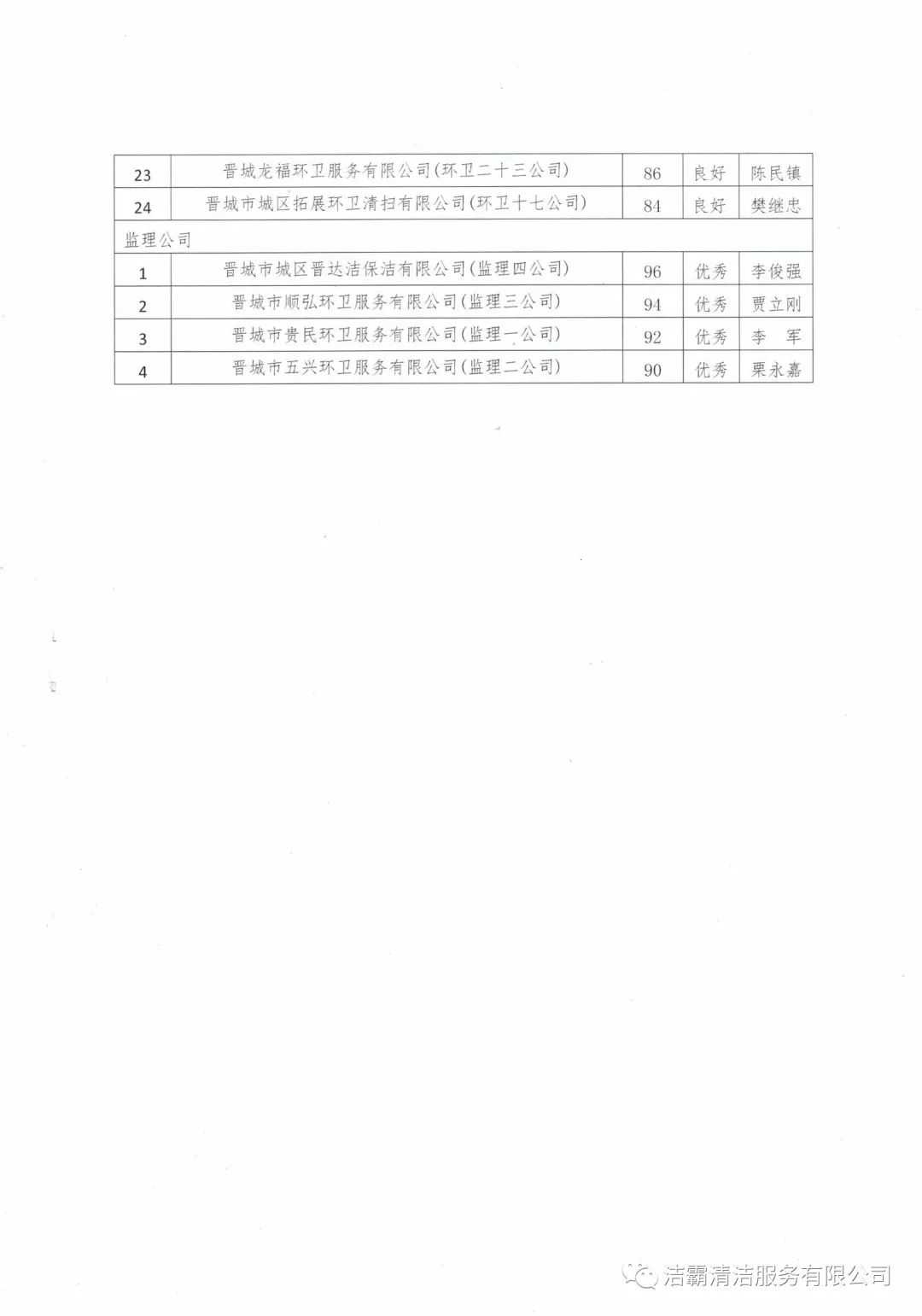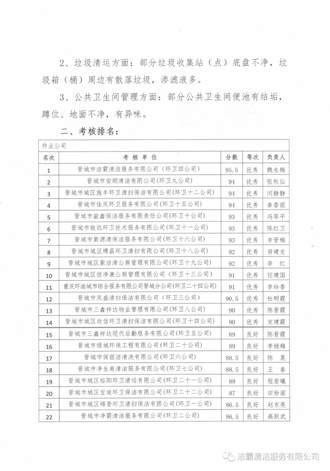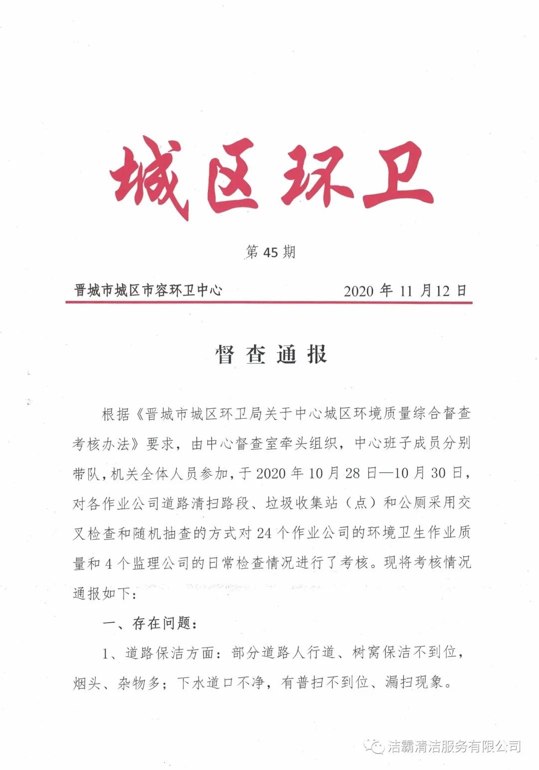 2020年10月28日—10月30日,晉城市城區(qū)市容環(huán)衛(wèi)中心由中心督查室牽頭組織,中心班子成員分別帶隊,機(jī)關(guān)全體人員參加,對各作業(yè)公司道路清掃路段、垃圾收集站(點(diǎn))和公廁采用交叉檢查和隨機(jī)抽查的方式對24個作業(yè)公司的環(huán)境衛(wèi)生作業(yè)質(zhì)量和4個監(jiān)理公司的日常檢查情況進(jìn)行了考核。晉城市潔霸清潔服務(wù)股份有限公司所屬的環(huán)衛(wèi)四公司分?jǐn)?shù)最高,名列第一。
