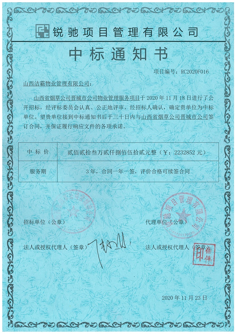 2020年11月18日,山西省煙草公司晉城公司物業(yè)管理服務(wù)項(xiàng)目開標(biāo)會(huì)議在晉城市文昌東街1560號(hào)南環(huán)供電營(yíng)業(yè)站一樓東會(huì)議室舉行。在經(jīng)過(guò)幾個(gè)小時(shí)的激烈競(jìng)標(biāo)過(guò)程評(píng)選后,從開標(biāo)室傳出喜訊,山西潔霸物業(yè)管理有限公司成功中標(biāo)。中標(biāo)金額為2232852元,合同期一年。此次中標(biāo)為潔霸物業(yè)今年的業(yè)績(jī)?cè)偬硪还P輝煌。