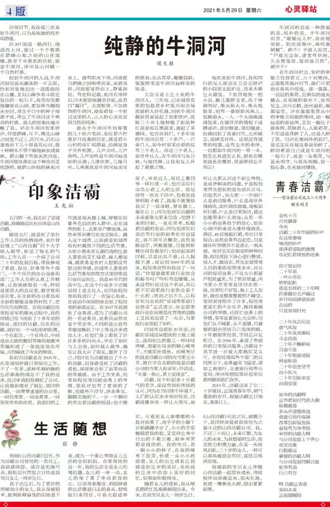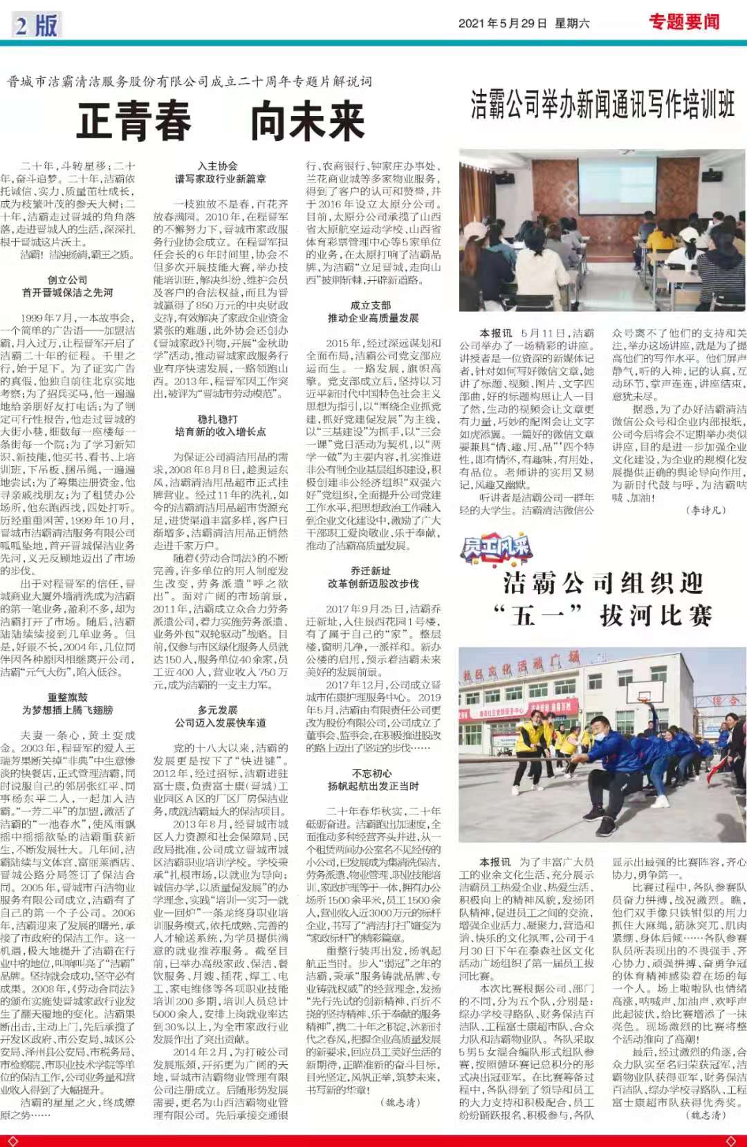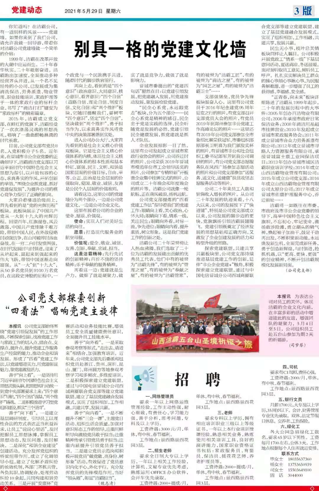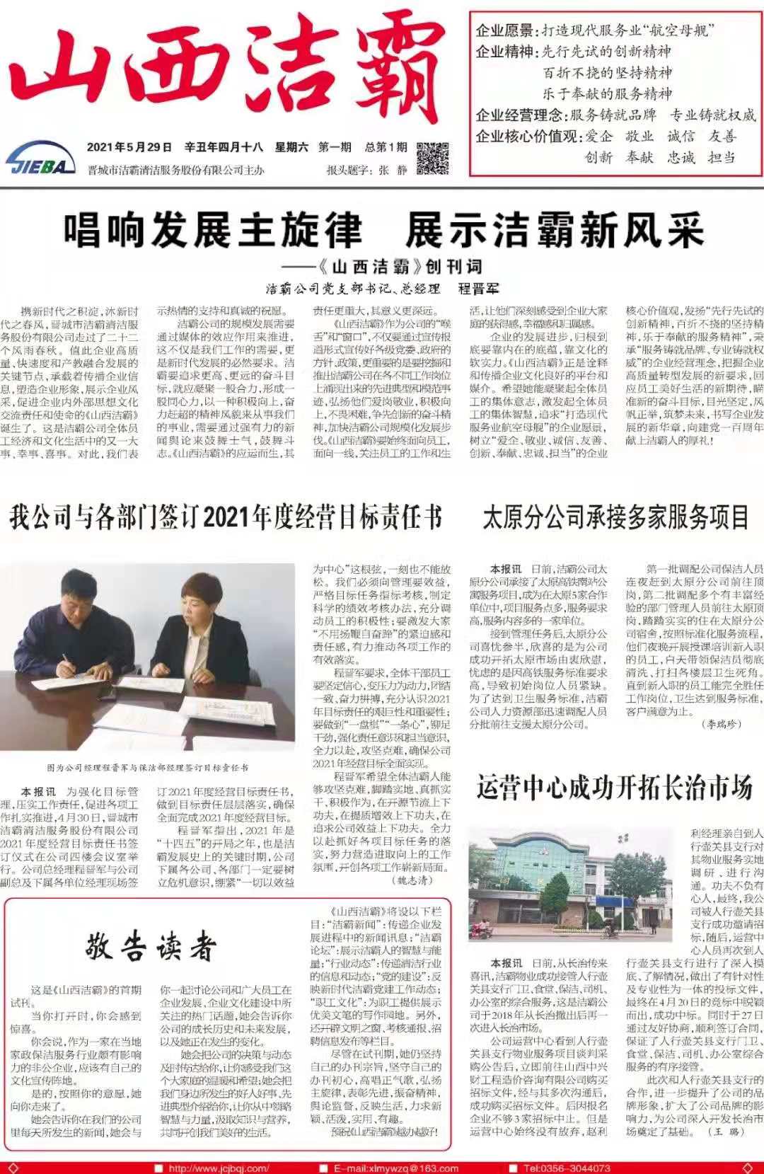 今天是2021529日,經(jīng)過(guò)一個(gè)多月的緊張籌辦,《山西潔霸》報(bào)紙終于創(chuàng)刊啦!這是潔霸人的一件大喜事,也是潔霸人的驕傲!伴隨著《山西潔霸》紙質(zhì)版的內(nèi)部發(fā)行,電子版也同步與你見面了。希望你能通過(guò)這個(gè)宣傳窗口,更好地走近潔霸,了解潔霸,關(guān)注潔霸,支持潔霸。