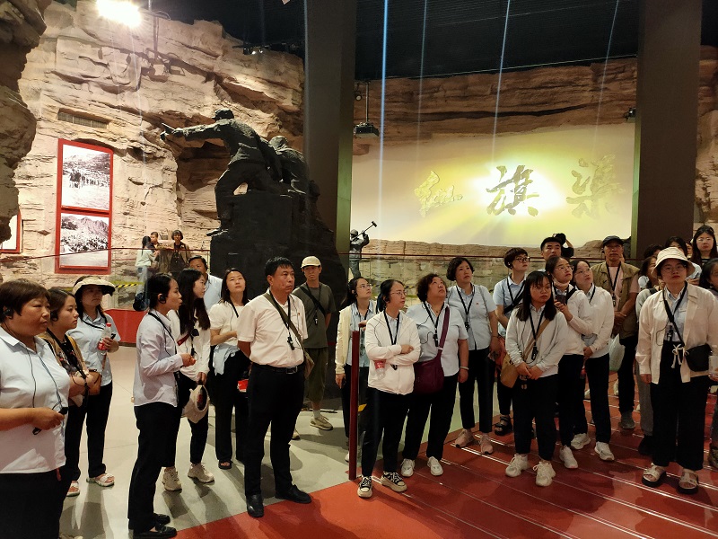 走進紅旗渠紀念館,大家跟隨講解員的腳步,在千年旱魔,世代抗爭;紅旗引領(lǐng),創(chuàng)造奇跡;英雄人民,太行豐碑;山河巨變,實現(xiàn)夢想;繼往開來,精神永恒五個部分逐一駐足學習,通過一件件珍貴的物品,一幅幅生動的圖片、一幀幀震撼的畫面、一個個感人的故事,讓大家身臨其境感受到林州人民建造人工天河時不畏艱險,頑強拼搏,緊靠一錘一鏟削平1250座山頭、鑿通211個隧道、架設151個渡槽的恢弘場景。在場的各位都深深地被“自力更生、艱苦創(chuàng)業(yè)、團結(jié)協(xié)作、無私奉獻”的紅旗渠精神所感動,切實感受到中華民族勤勞堅韌的優(yōu)良傳統(tǒng),領(lǐng)悟社會主義是干出來的,新時代是奮斗出來的。