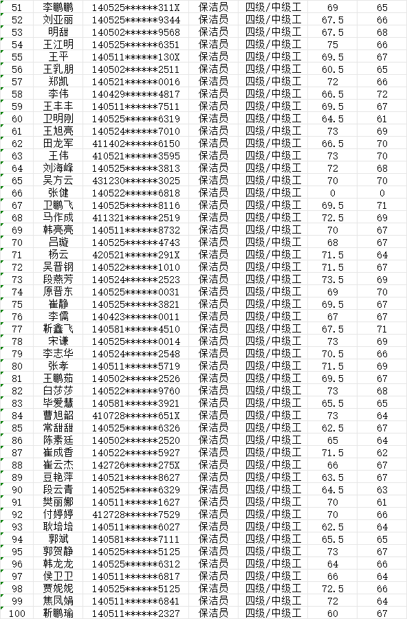 晉城市潔霸清潔服務(wù)股份有限公司職業(yè)技能等級認(rèn)定中心現(xiàn)將2024年1月28日認(rèn)定人員成績公示如下: