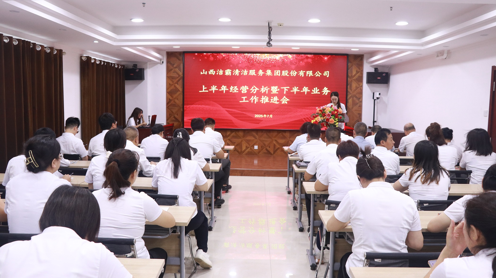 合眾力、潔霸物業(yè)、城區(qū)保安、保潔部、潔霸超市、百潔物業(yè)、培訓(xùn)學(xué)校、智能科技等公司及部門分別圍繞上半年主要經(jīng)營指標(biāo)完成情況、新增業(yè)務(wù)項目及運營情況、存在的各種問題及改進措施、下半年工作計劃、工作創(chuàng)新思路等情況作了現(xiàn)場匯報。人力資源部、綜合辦公室和財務(wù)部也分別就上半年的工作作了匯報。